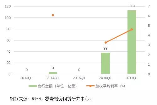 从发行金额来看,2017年第一季度与去年同期发行的38亿元相比,同比增长了197.37%。